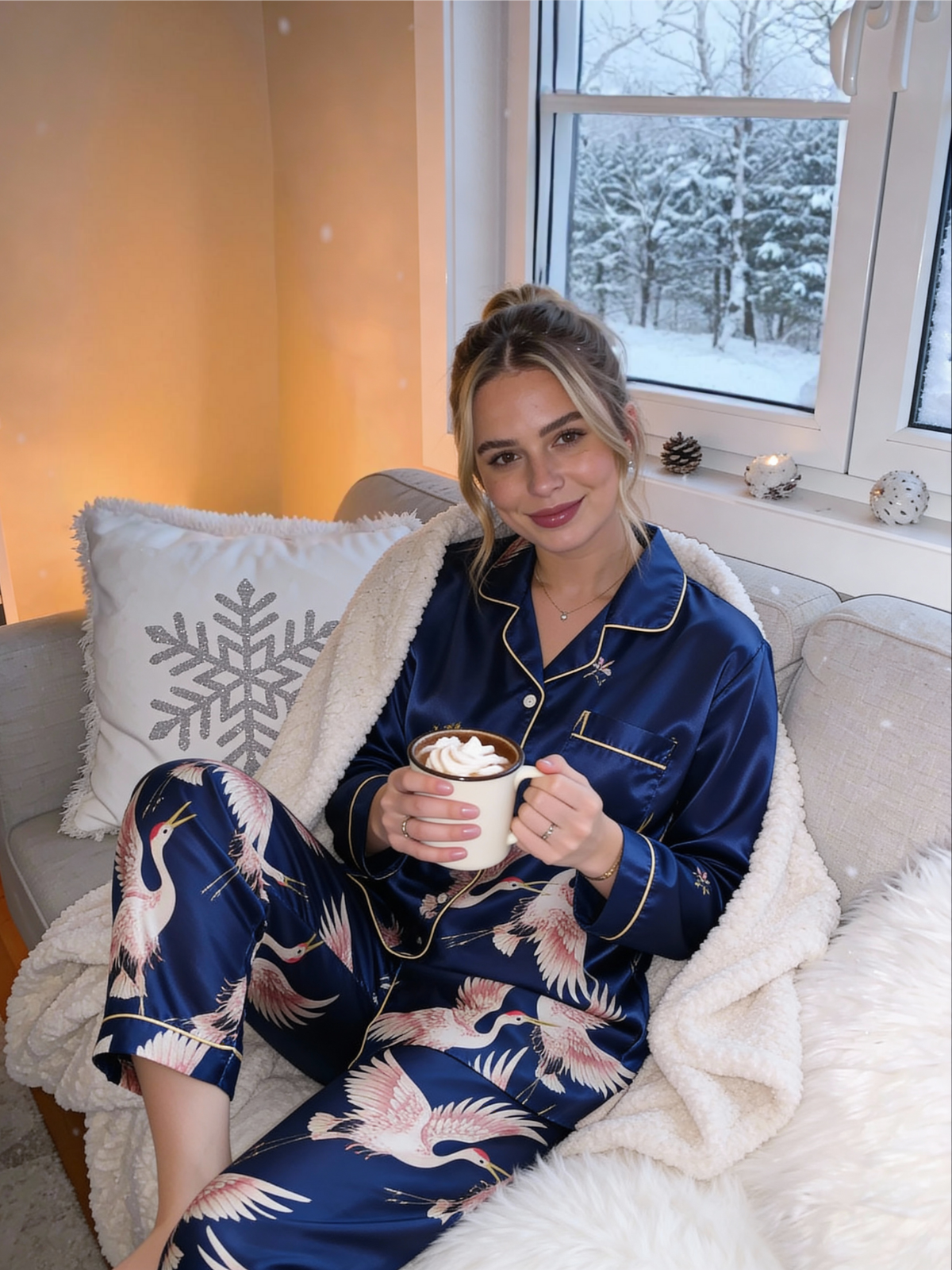 Silk Crane Print Long Sleeve Pajamas Set