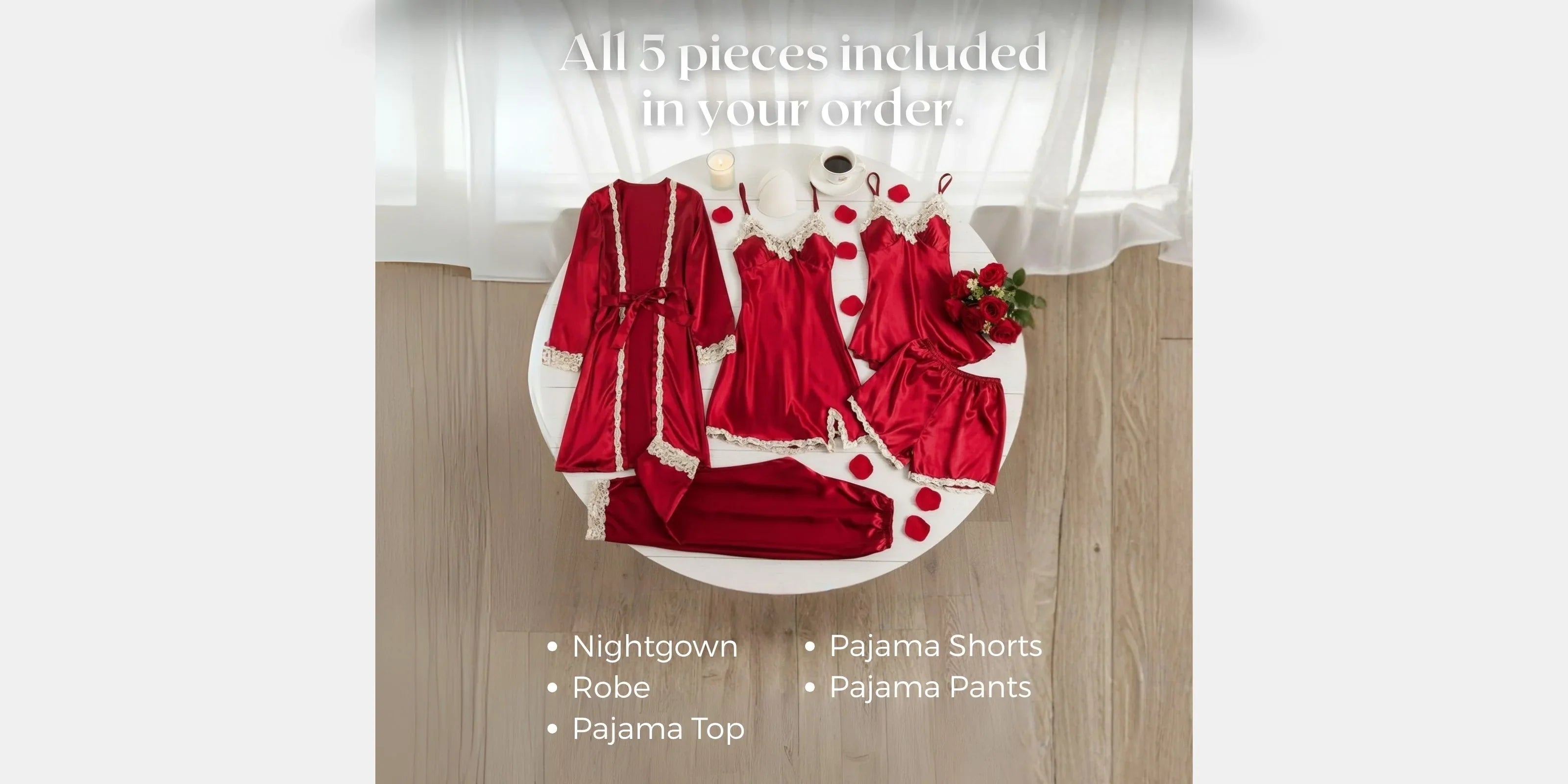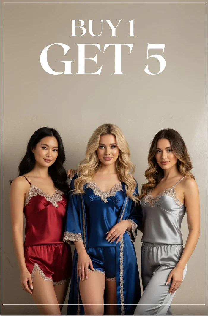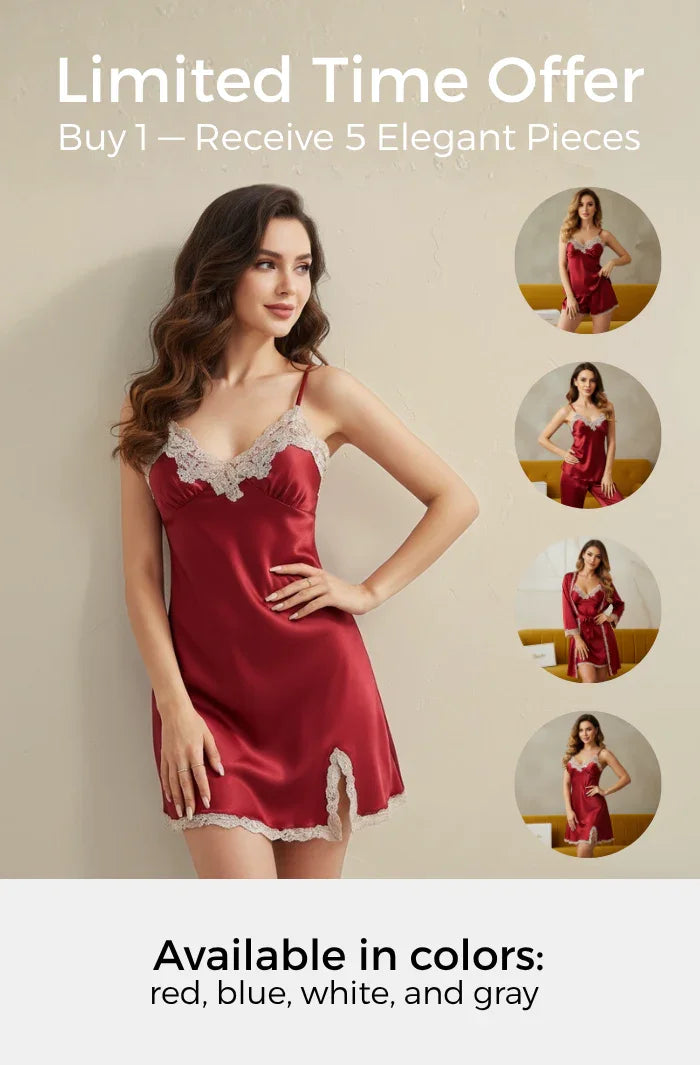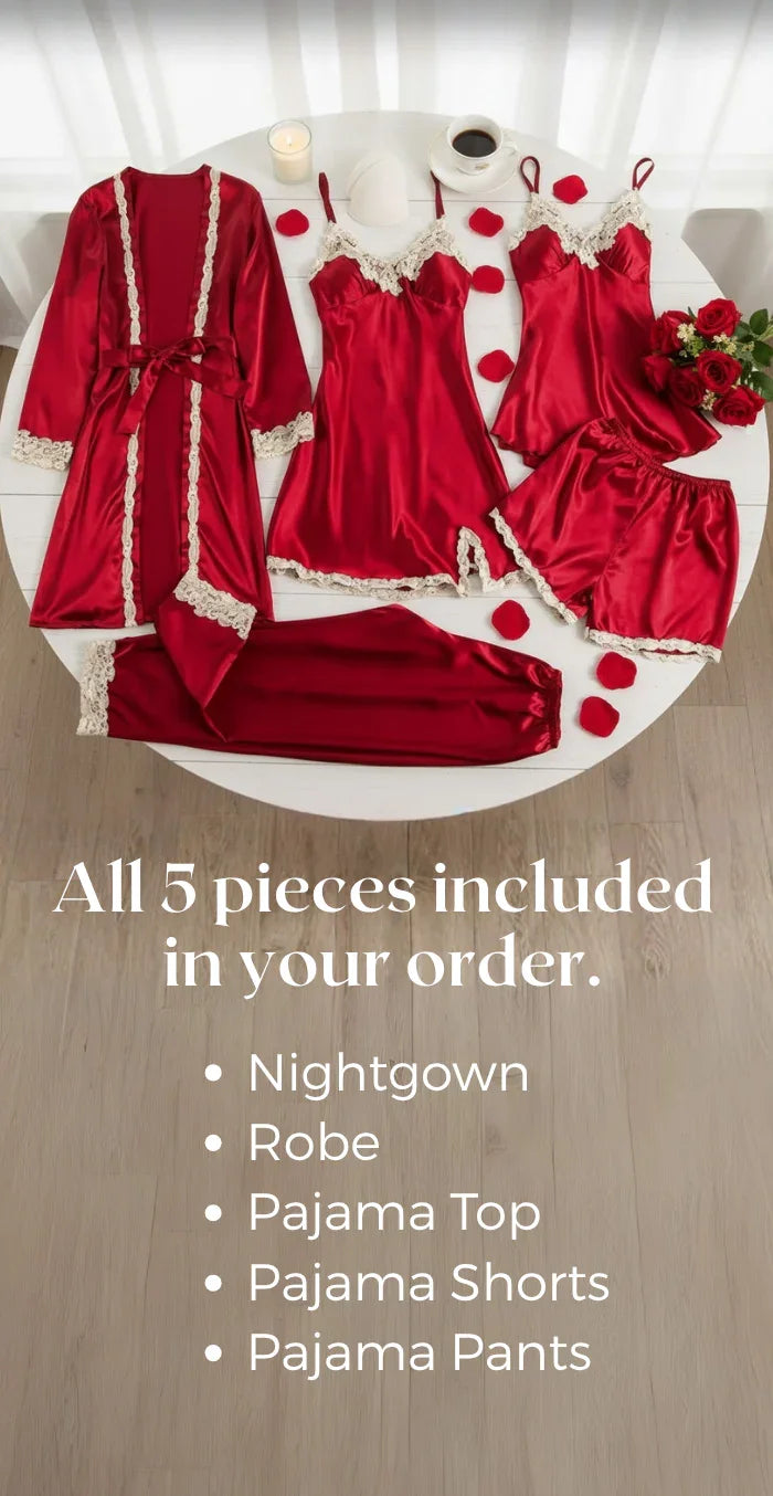Design: Includes 1 robe, 1 sleeveless top, 1 pair of long pants, 1 pair of shorts, and 1 lace-trimmed nightdress – all coordinated in a sensual and elegant style